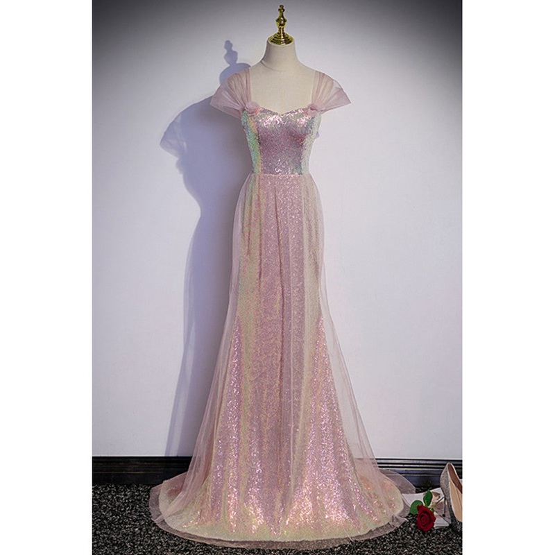 Sparkling powder blusher pink sequins off shoulder short sleeve evening dress powder blusher pink trumpet/mermaid open back zipper sweep tail prom dress