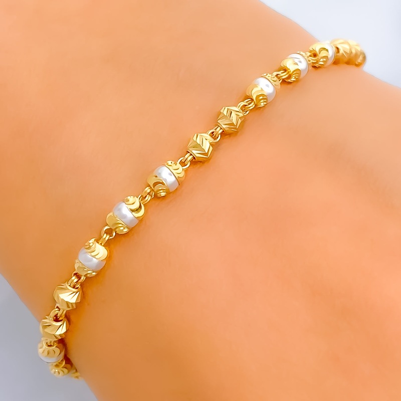 This special dainty bracelet, crafted in 22k gold and weighing 5.0 grams, elegantly showcases pearls set against a yellow gold finish. It measures 7.5 inches, with an additional 0.5 inches of adjustable links for a custom fit. The bracelet is secured with a hook lock and clasp, ensuring a blend of delicate beauty and practicality. Ideal for those who appreciate the timeless elegance of pearls paired with the luxury of gold, this bracelet is a charming and refined choice for any jewelry collection.