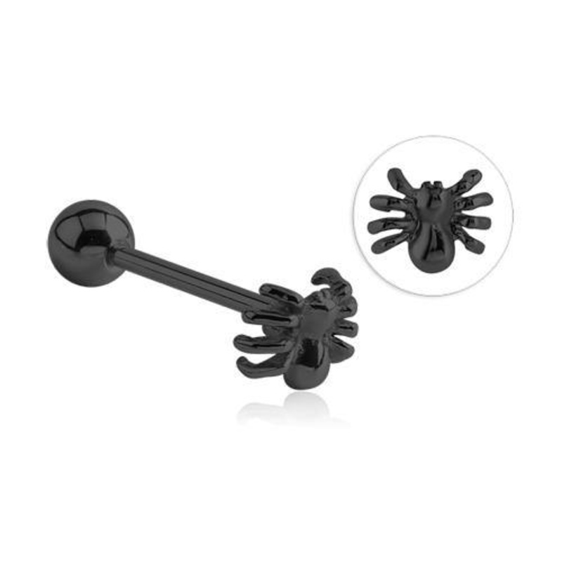 The spider tongue ring is made from black PVD coated 316L stainless steel with external threading. The 14 gauge barbell is 5/8" long.