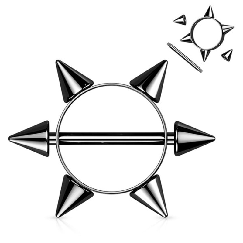 These 14 gauge spiked nipple rounders are made from black PVD coated 316L stainless steel with external threading. Diameter refers to the interior diameter of the rounder, not the barbell length. The 5x5mm cones are removable.