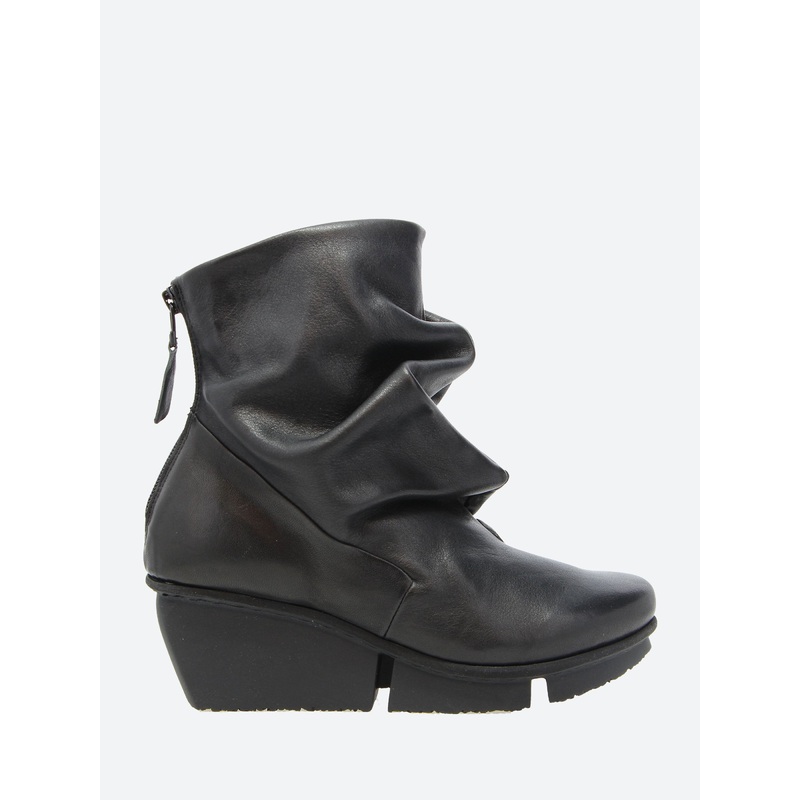 The shape of this casual ankle boot is created by the volume of the soft leather, which folds over the entire front area in gentle waves. The boot fastens with a zipper at the back.