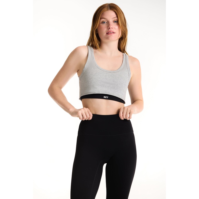 Sporty Roster Bra in Orca with medium-high support in cooling Sportbody fabric. Features scoop neckline and attached cropped heather jersey.