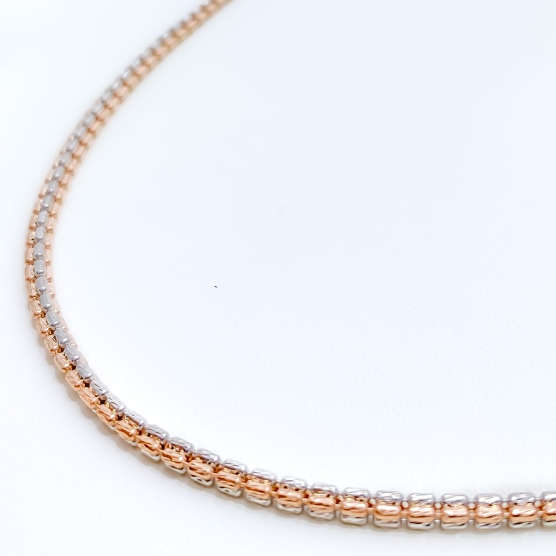 This unique 22K rose gold chain features square beads and a stunning two-tone design with elements of rose and white gold. It weighs 14.2 grams and extends 20 inches in length, complemented by a 2.5 mm width, offering a robust yet elegant look. The chain i