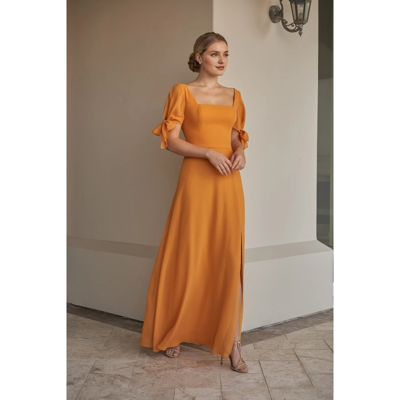 Be the first to review “Square neckline chiffon A-line bow front slit bridesmaid dress”