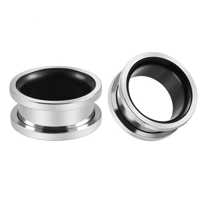 These screw-on tunnels are made from 316L surgical grade stainless steel with external threading. They have a wearable area of 1/4" between flares. The back side unscrews for easy insertion. Choose your size below.
