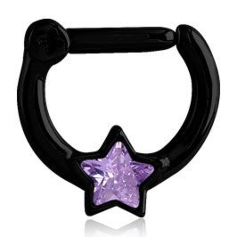 The 16 gauge cz star septum clicker is made from black PVD coated 316L stainless steel. The 5/16" long barbell is hinged on one side and snaps firmly shut on the other. The interior diameter is measured inside the clicker from top to bottom.