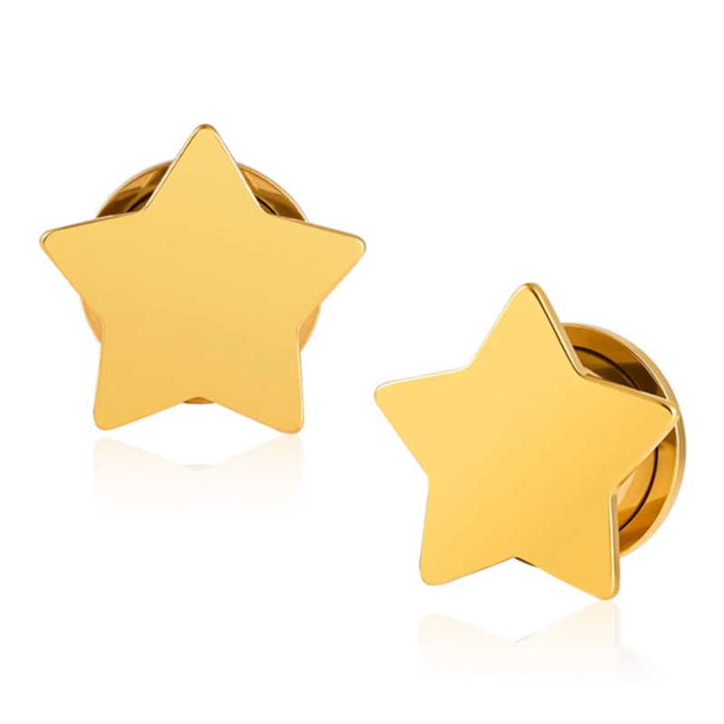 These screw-on star plugs are made from gold PVD coated 316L surgical grade stainless steel with external threading. They have a wearable area of 1/4" between flares. The back side unscrews for easy insertion. Choose your size below.