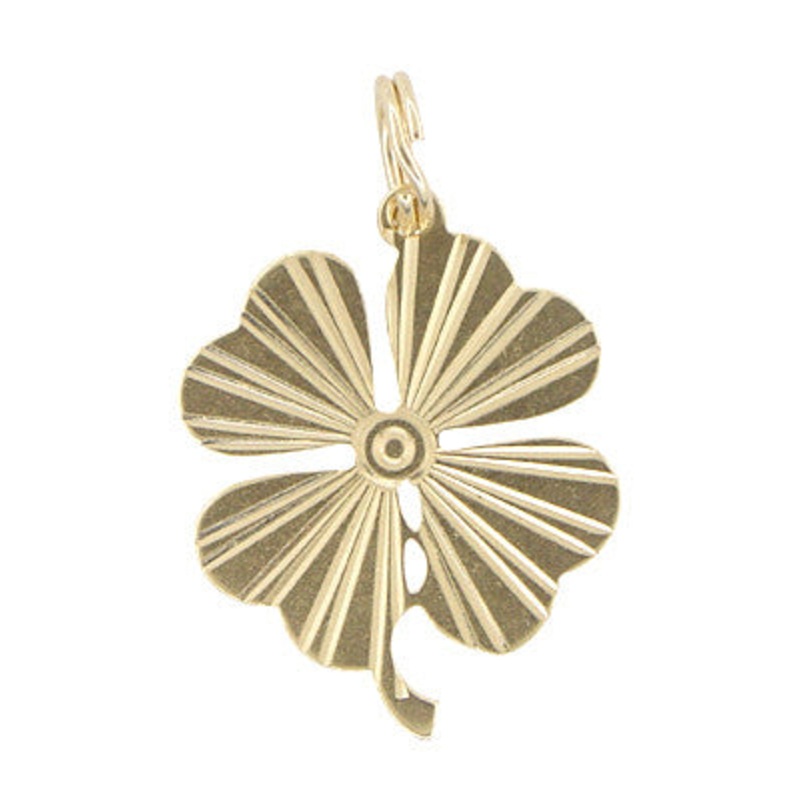 This splendid 14K yellow goldvintage lucky four leaf clover charm radiates joy!The light capturing straight line carved grooved design of this estate shamrock pendant emanatesfrom the center of the clover for a shimmerystarburst effect. Made in the1960's,