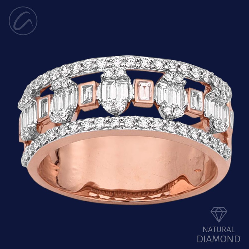 This Stately Bold Diamond Band, crafted in 18k rose gold, is a striking blend of elegance and strength. Weighing 5.1 grams, the band features 0.72 carats of round and baguette diamonds, each of F-G color and VS quality, set in a design that exudes confiden