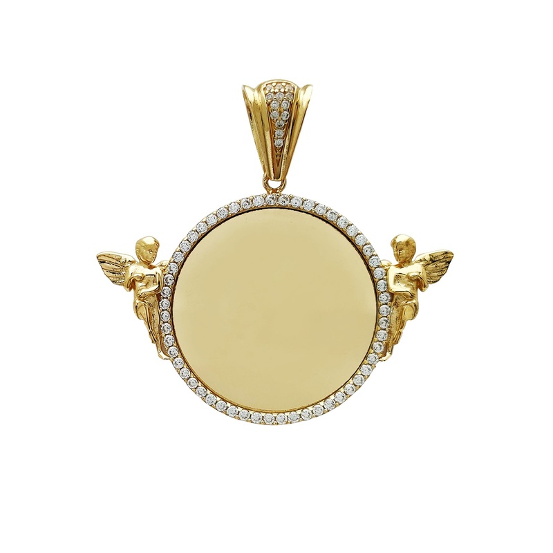 Stone-Set Angels Round Medallion Memorial Picture Pendant (14K)