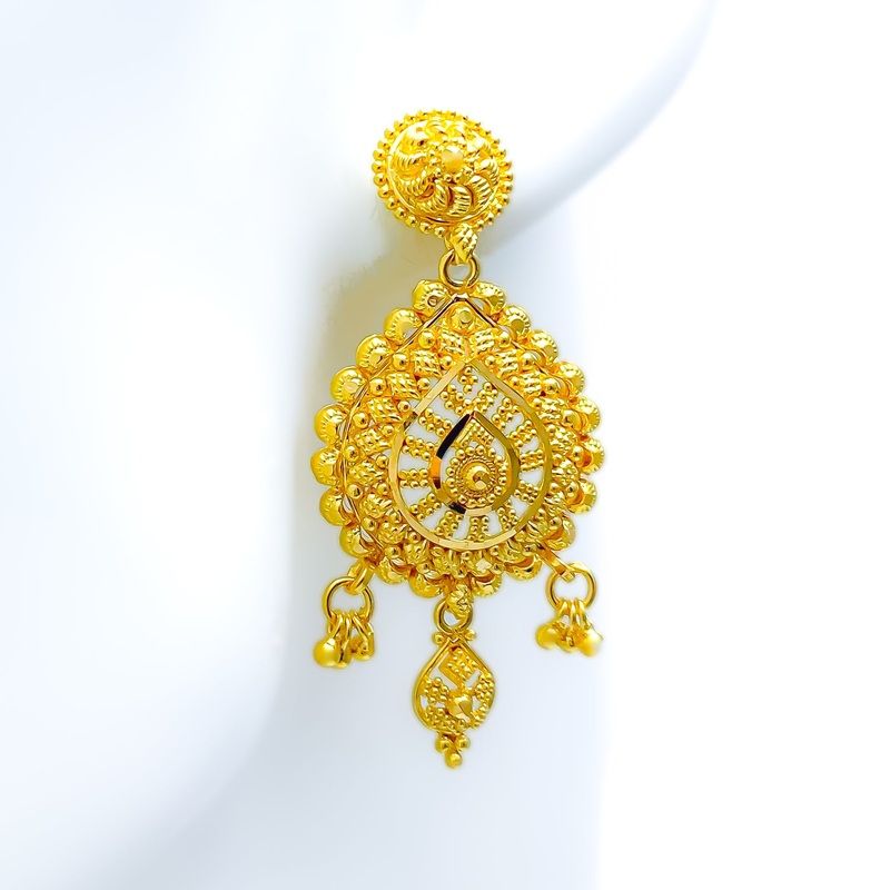 Elevate your festive look with these 22k yellow gold earrings, weighing a substantial 10.5 grams. Showcasing a tasteful striped pattern, these drop earrings blend traditional charm with contemporary flair. Measuring 1.75" in length, their gleaming yellow g