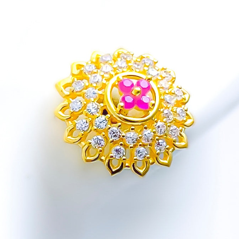 These 22k yellow gold tops, with a weight of 4.1 grams, embody a stylish and sleek design, enhanced by the brilliance of cubic zirconia. The earrings, measuring 0.5 inches in diameter, offer a subtle yet striking presence. Their screw-back post ensures a secure and comfortable fit. Perfect for those seeking an accessory that combines contemporary elegance with a hint of sparkle, these tops are an excellent choice for both casual and formal occasions.