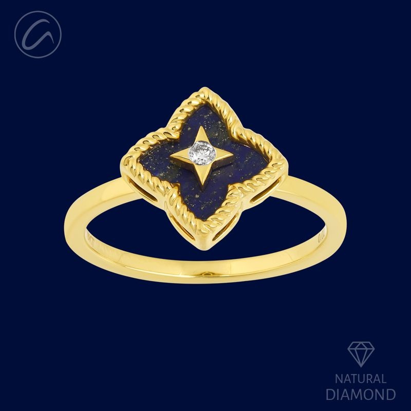Elegant and contemporary, this 18k yellow gold ring features a dazzling floral design, blending sophistication with a modern touch. Weighing 3.4 grams, its polished gold finish enhances the beauty of the delicately crafted flower-shaped colored ceramic stone, adding a unique and artistic flair. A shimmering 0.02ct round brilliant-cut diamond, graded G-H in color and VS in quality, adds a refined sparkle, elevating the overall design. Sized at 7.25, this exquisite ring offers a stylish yet timeless presence, perfect for those who appreciate delicate detailing with a hint of brilliance. Whether worn as a statement piece or paired with other fine jewelry, this ring is a must-have addition to any collection.