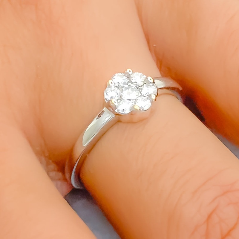 This elegant 18k white gold ring, weighing 2.1 grams, showcases a refined diamond cluster design with 0.55 carats of round brilliant diamonds in F-G color and VS quality. The clustered arrangement adds a touch of sparkle while maintaining a subtle, sophisticated charm, making it perfect for everyday elegance or understated luxury. Sized at 6, with resizing options available, this ring is ideal for those who appreciate classic beauty with a hint of refinement, offering versatile style for any occasion.