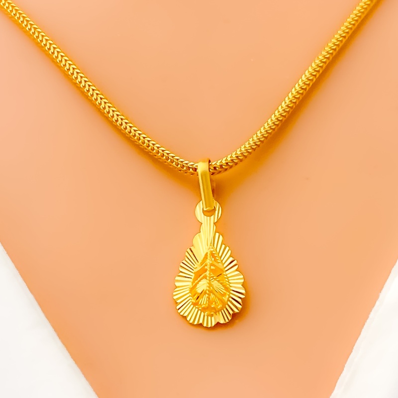 Delicately designed with a touch of timeless elegance, this 22k yellow gold pendant radiates a soft, ethereal charm. Weighing 1.6 grams, its polished gold finish highlights the intricate craftsmanship, creating a luminous and graceful appeal. Measuring 1 inch in length, this versatile pendant is perfect for effortless everyday wear or as a refined accent for special occasions. Designed for those who appreciate understated beauty with a sophisticated touch, this exquisite piece is a must-have addition to any fine jewelry collection.