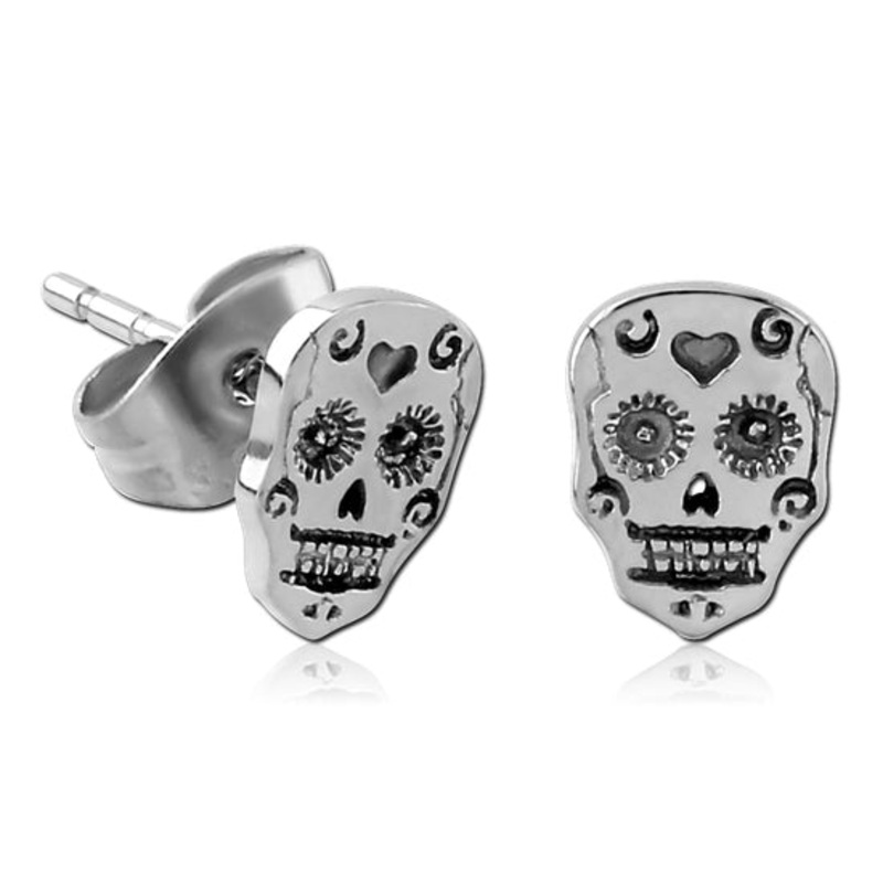 These 20 gauge sugar skull stud earrings are made from cast 316L stainless steel.