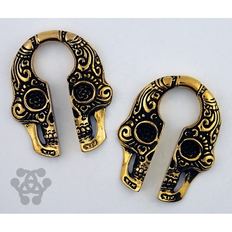 These sugar skull weights are cast from solid yellow brass by Oracle Body Jewelry. They fit stretched ear lobes sized 7/16-inch or larger.