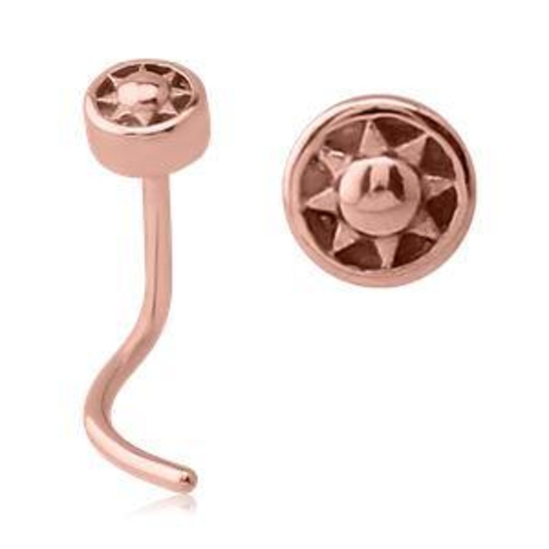 The 20 gauge sun nostril screw is made from rose gold PVD coated 316L stainless steel with 1/4" wearable area.
