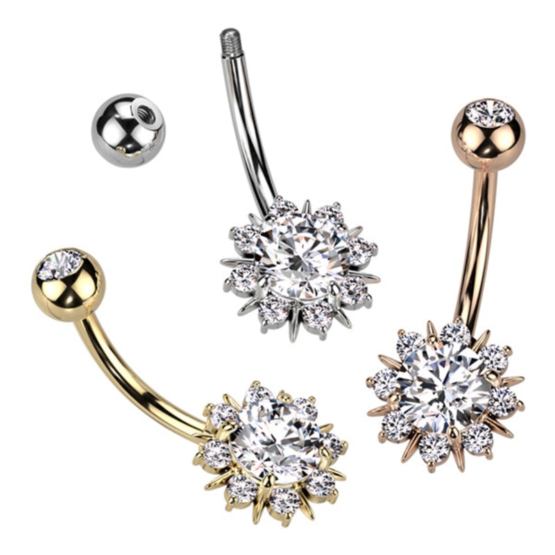 Sunburst CZ Belly Ring 14g – 3/8″ long (10mm) Clear Gold Stainless