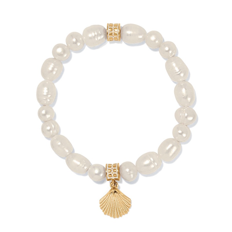 The warmth of gold meets the luminosity of freshwater pearls in this comfortable stretch bracelet accented by a sculpted shell filled with lifelike detailing.