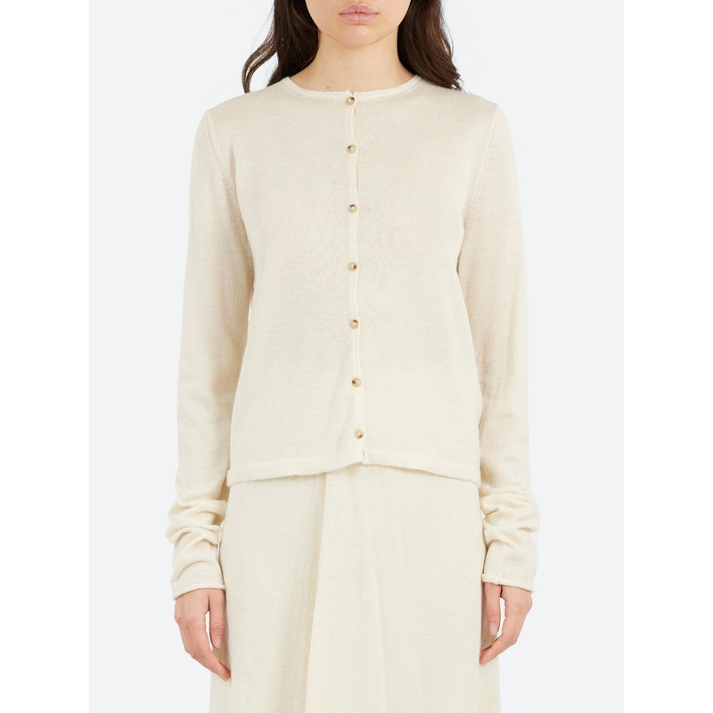 The Lauren Manoogian ivory crewneck cardigan is crafted from a super-fine, lightweight alpaca knit. It features set-in shoulders and elongated sleeves, along with tortoise-hued buttons for the front closure.