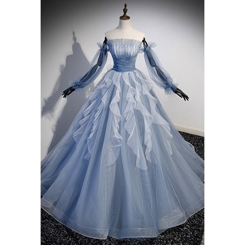 Sweet and elegant sky blue beaded sequins off the shoulder long sleeved ball dress sky blue A-line/princess strapless backless strap and ground length prom dress