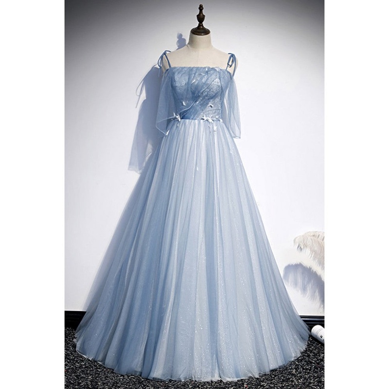 Sweet Sky Blue Thin Shoulder Strap Sleeveless Applique Lace Bead Dress Dress with Sky Blue A-line Glittering Thin Gauze Open Back Strap Long Ruffle Edge Evening Dress