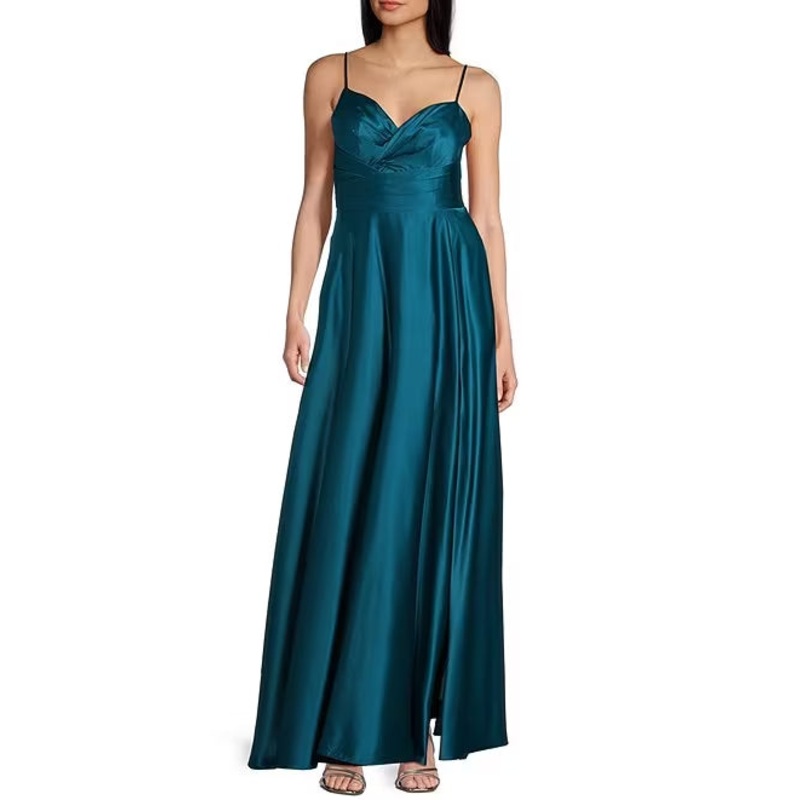 Sweetheart neck thin shoulder strap pleated waist belt front slit prom dress
