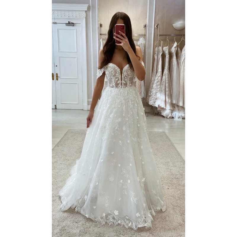 Sweetheart Off Shoulder sheer A-line lace decal illusion empire wedding dress