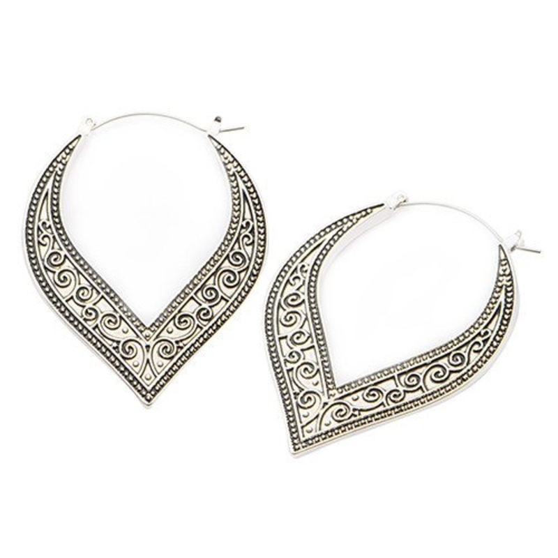 These 20 gauge swirl hoop earrings have a burnished silver finish. Each one measures about 1-7/8" wide by 2-3/8" long. The hinged post is made from 316L surgical steel. They can be worn as regular earrings, but the oversize design is intended to fit comfor