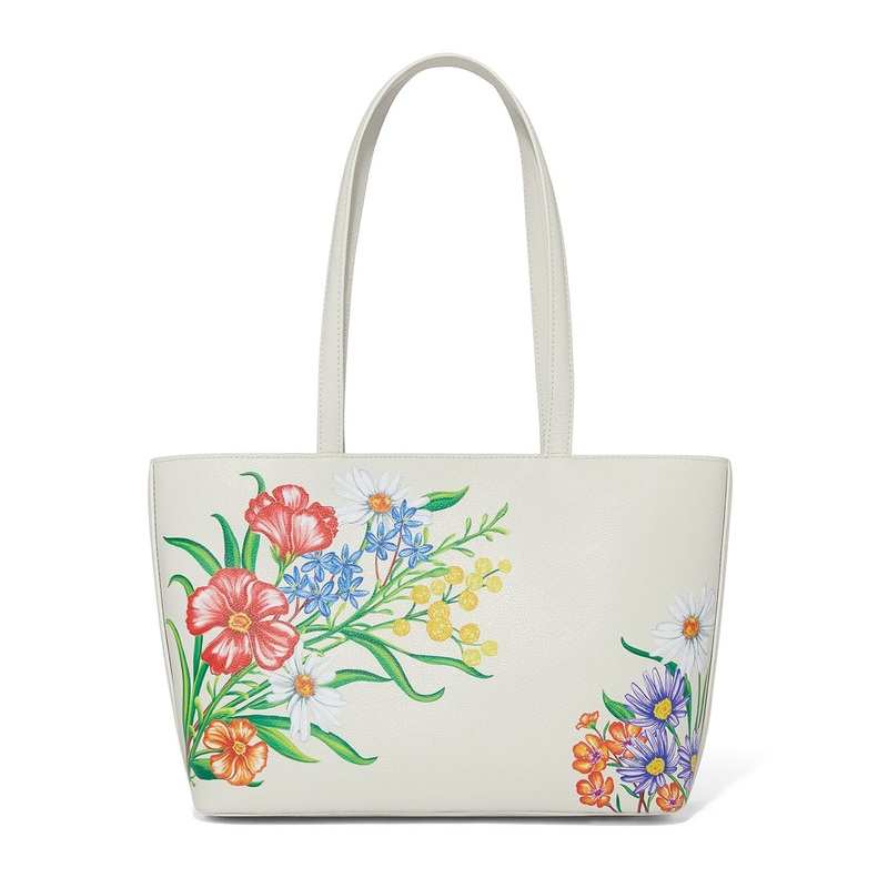Inspired by her trip to Australia, designer Catherine Hong hand-painted their local flowers including golden wattle, copper cup, swan river daises and nodding blue lilies and we printed them onto this fine leather tote. Bottom reads, be like a wildflower beautiful and free.