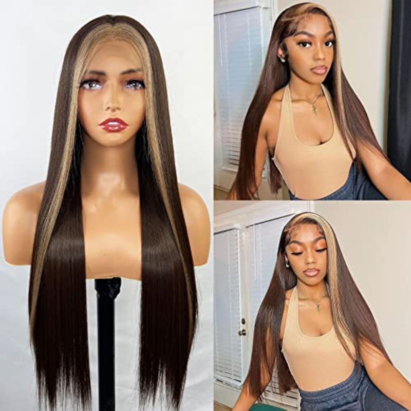 Synthetic Lace Front Wig with Blonde HighlightsIntroducing an exquisite Long Brown Wig with Blonde Highlights! This beautiful wig has a length of 22 inches and features a density of 150%, giving you natural-looking hair. The silky straight texture and Japa