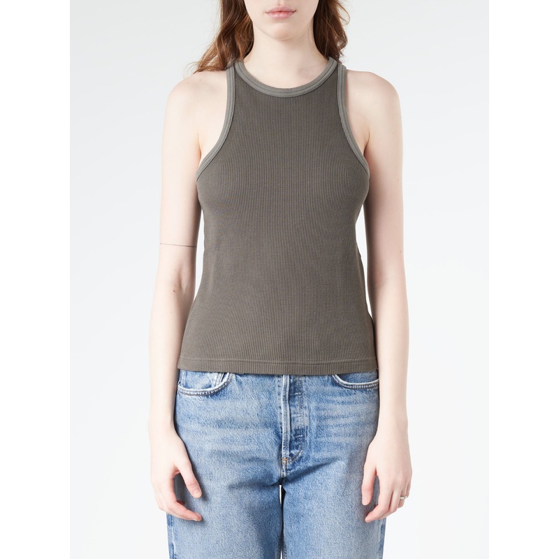 This tank boasts a ribbed design in a delicate pink color. It is expertly made from stretchy cotton for maximum comfort.Round neckSleevelessWaffle knitLogo at the backSlim fitMaterialsFabric Content: 100% cottonSize GuideRuslana wears size S. She is 5'10";