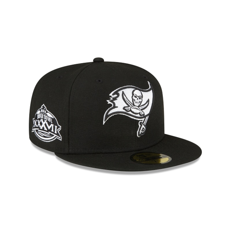 The Tampa Bay Buccaneers Sidepatch Black 59FIFTY Fitted Cap features an embroidered Buccaneers logo at the front panels with a Super Bowl XXXVII patch at the right-wear side. Additional details include the official NFL Shield at the rear and a gray undervi
