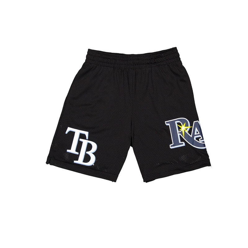 The Tampa Bay Rays Mesh Shorts features a screen-printed Rays logo at the left leg with a team wordmark at the right leg.