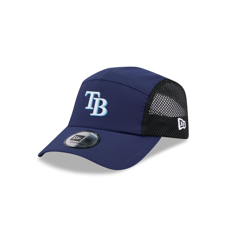 The Tampa Bay Rays Poly Runner Cap features a heat sealed Rays logo at the front panels with mesh side panels. Additional details include a silicone patch above an adjustable drawstring closure at the rear.