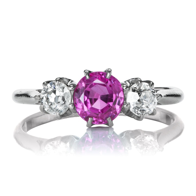 Burmese Purplish Pink Sapphire and Diamond Three Stone Ring