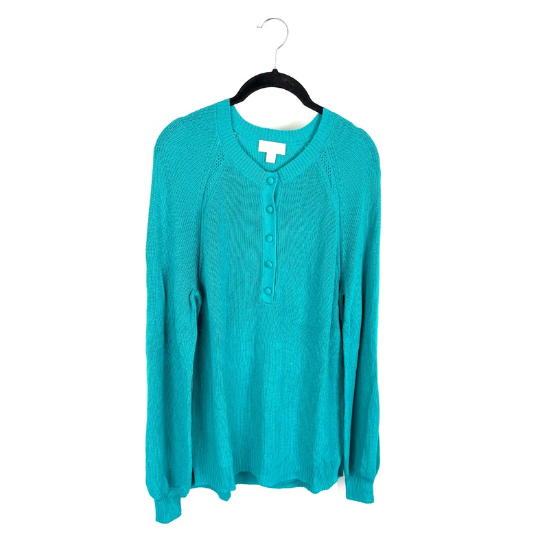 Brand new - donated from the designerBelle By Kim Gravel teal long sleeve top, with ruching at shoulders and arm cuffs, buttons down center of shirt, and made in a lightweight and soft materialSize small (Size 6/8)50% Cotton 38% Rayon 6% SpandexEstimated O
