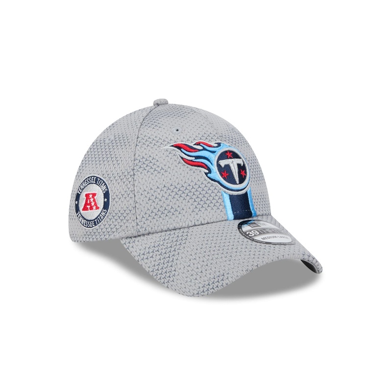 The Tennessee Titans 2024 Sideline 39THIRTY Stretch Fit Hat features an embroidered Titans logo at the front panels with a matching NFL Shield at the rear. Additional details include a Conference patch at the right-wear side and a gray undervisor.
