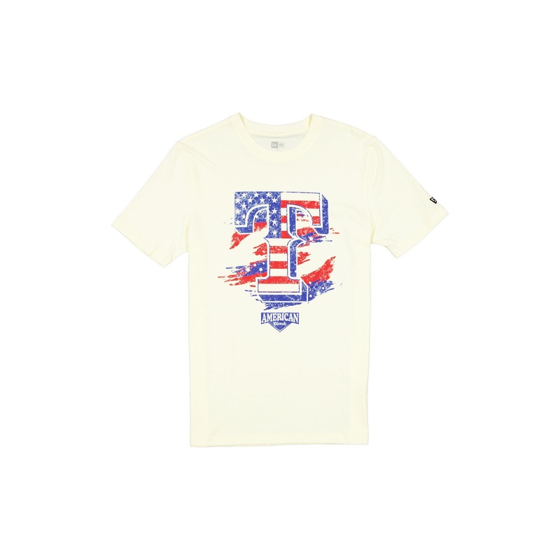 The Texas Rangers Independence Day 2025 T-Shirt a screen-printed American flag themed Rangers logo above an American Classic wordmark at the front.