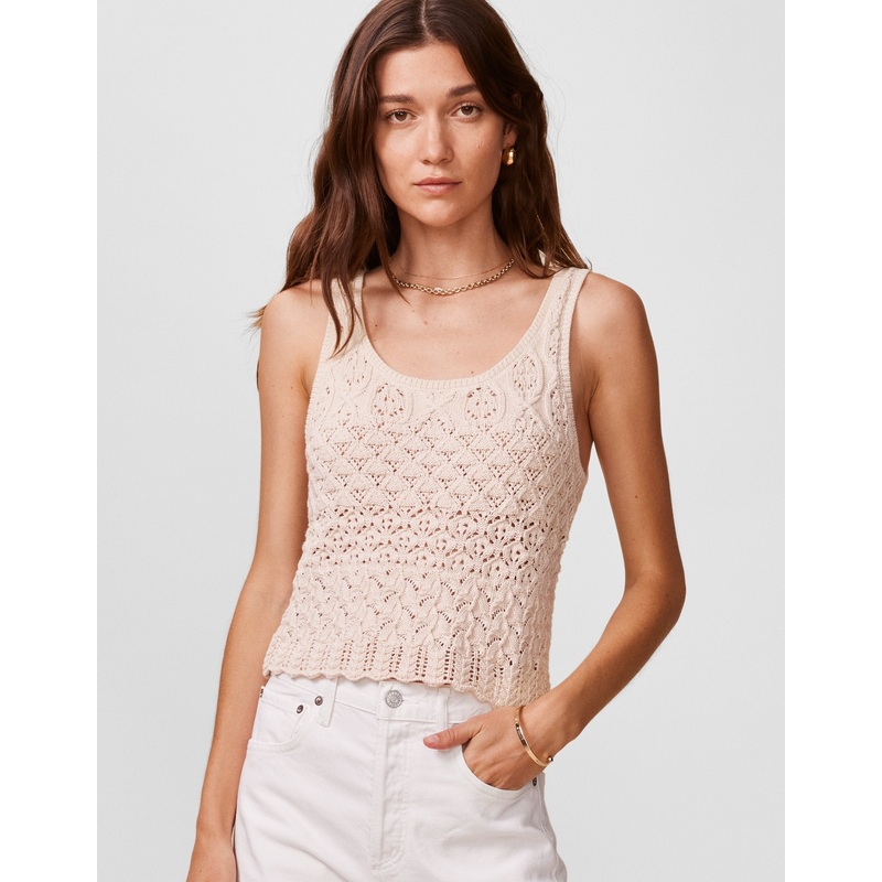 a summery sweater made for layering over swim or pairing with denim shorts. we knitted it from cotton in an intricate mixture of delicate cables and pointelle stitching for a beautiful texture. the scallop hem nods to our favorite vintage heirlooms.scoopne