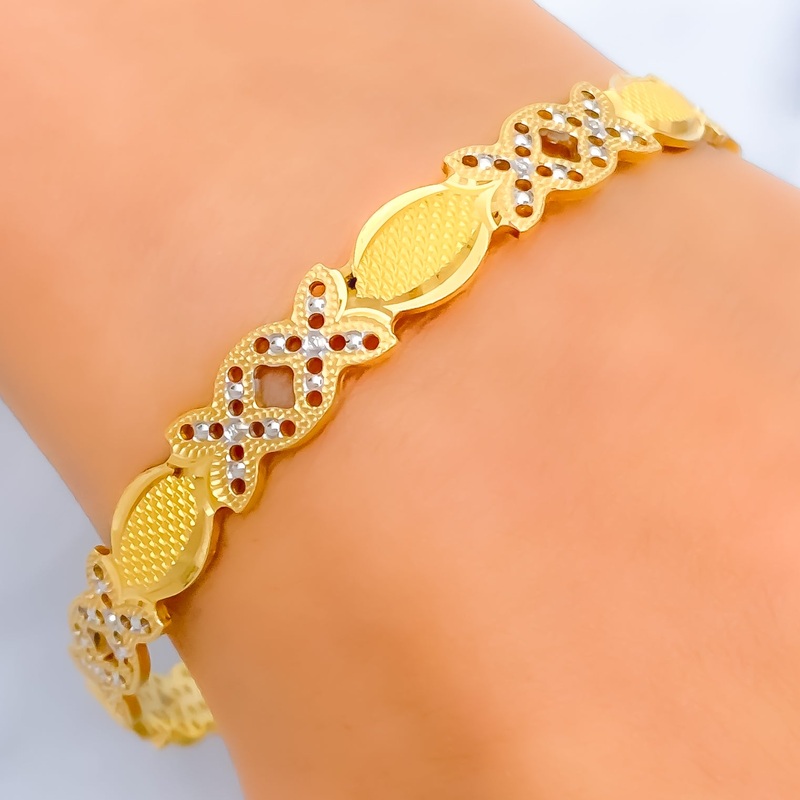 This textured twin flower 22k gold bangle, weighing an impressive 20.6 grams, showcases an exquisite blend of yellow and white gold finishes. The bangle is designed to fit a size 2.6, with an opening of 2.35 inches, ensuring a comfortable yet secure fit. T
