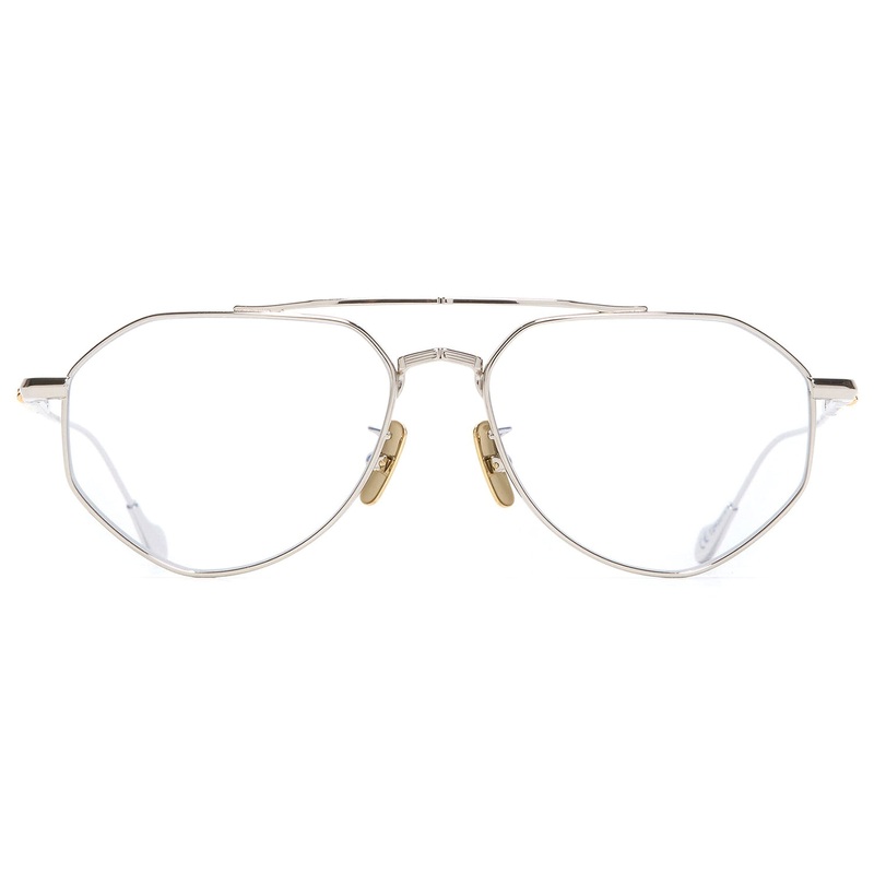 The Cutler and Gross x The Great Frog // Lynott is an angular aviator handcrafted in Japan from pure titanium. In collaboration with gothic jeweller The Great Frog, the frame features the signature Bones Link motif engraved on the double nose bridge and el