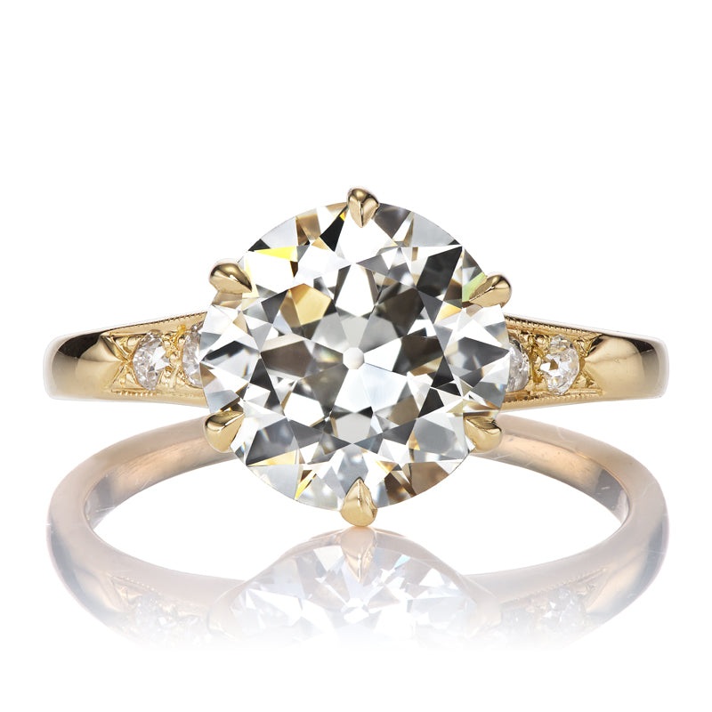 The Theo 2.66 ring is an AB original design made right here in NYC. The ring centers a GIA-certified 2.66-carat Transitional Cut diamond of J color, VS1 clarity. The stone is set in our signature 18kt yellow gold with two Old Cut diamonds on each shoulder. The ring is currently size 5.25 and can be resized!