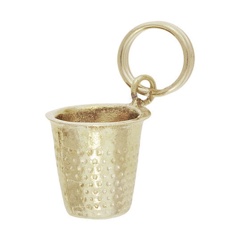 Made of 14K yellow gold, this three dimensional sewing thimble charm measures approximately 3/8 inch square, and has a 14K yellow gold split ring bail to easily and securely attach it to a charm bracelet.