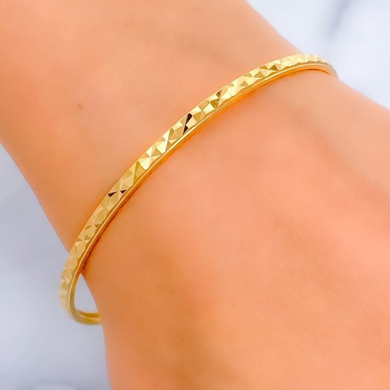The Thin Everyday Glowing 22k Gold Bangle, with a weight of 9.6 grams, is a testament to simplistic elegance and everyday luxury. Crafted in 22k gold, it features a polished yellow gold finish, giving it a subtle yet captivating glow. Sized at 2.6 and with an opening of 2.35 inches, this bangle is designed for comfort and daily wear. Perfect for those who seek a delicate, understated piece, this single bangle combines the timeless beauty of gold with a sleek, modern design, making it a versatile addition to any wardrobe.