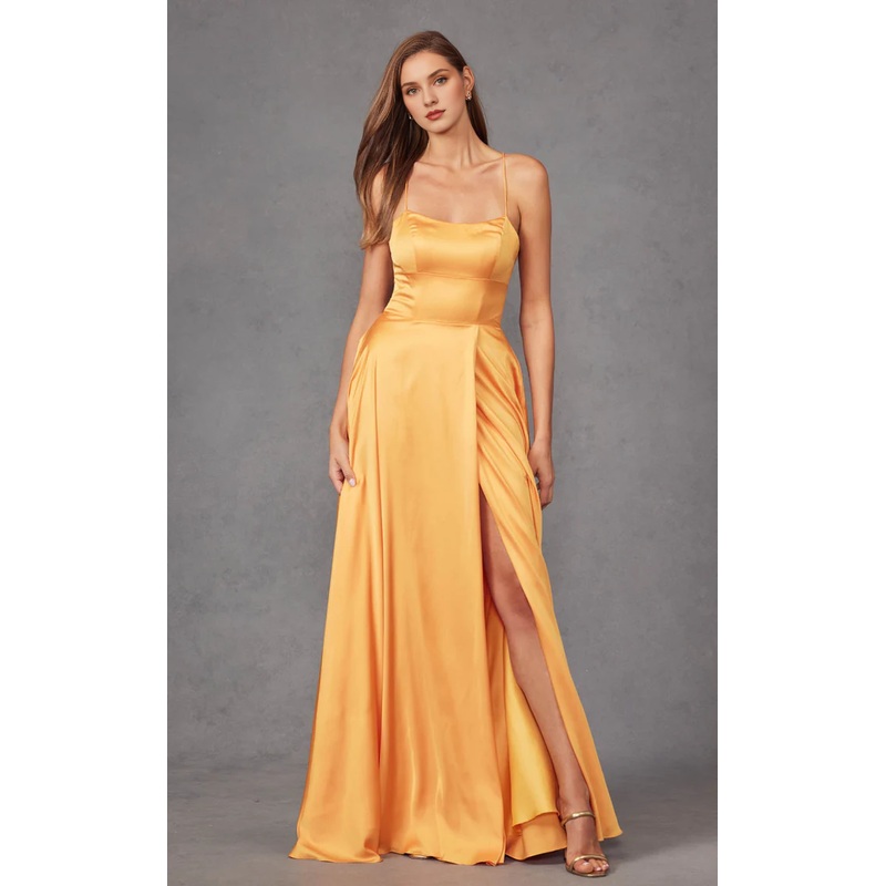 Thin shoulder strap satin backless slit and floor length Prom dress