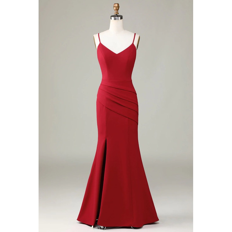 Thin shoulder strap slit sleeveless wine red bridesmaid dress