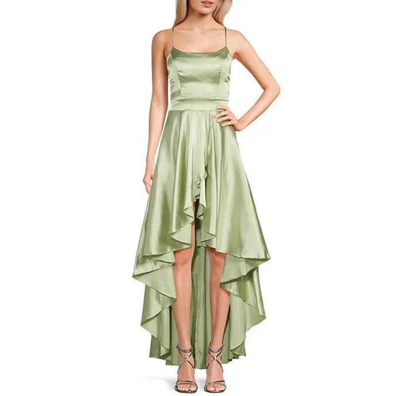 Thin shoulder strap square collar hollowed out satin back high and low prom dress