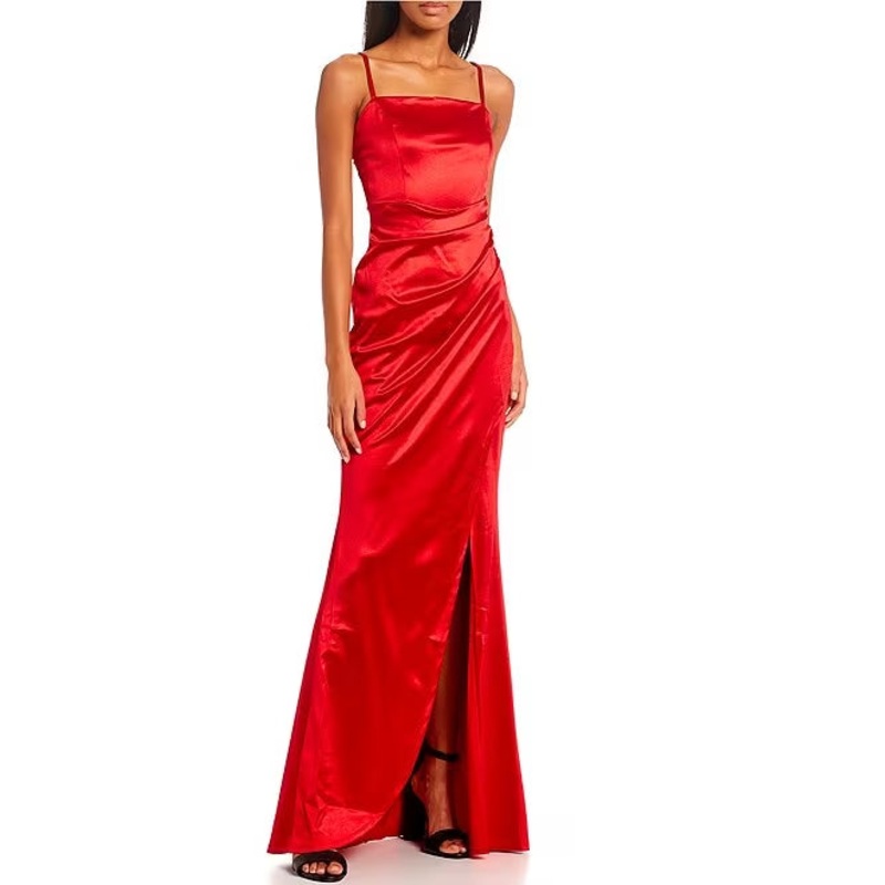 Thin shoulder strap square collar imitation wrapped body slit hem satin surface long prom dress
